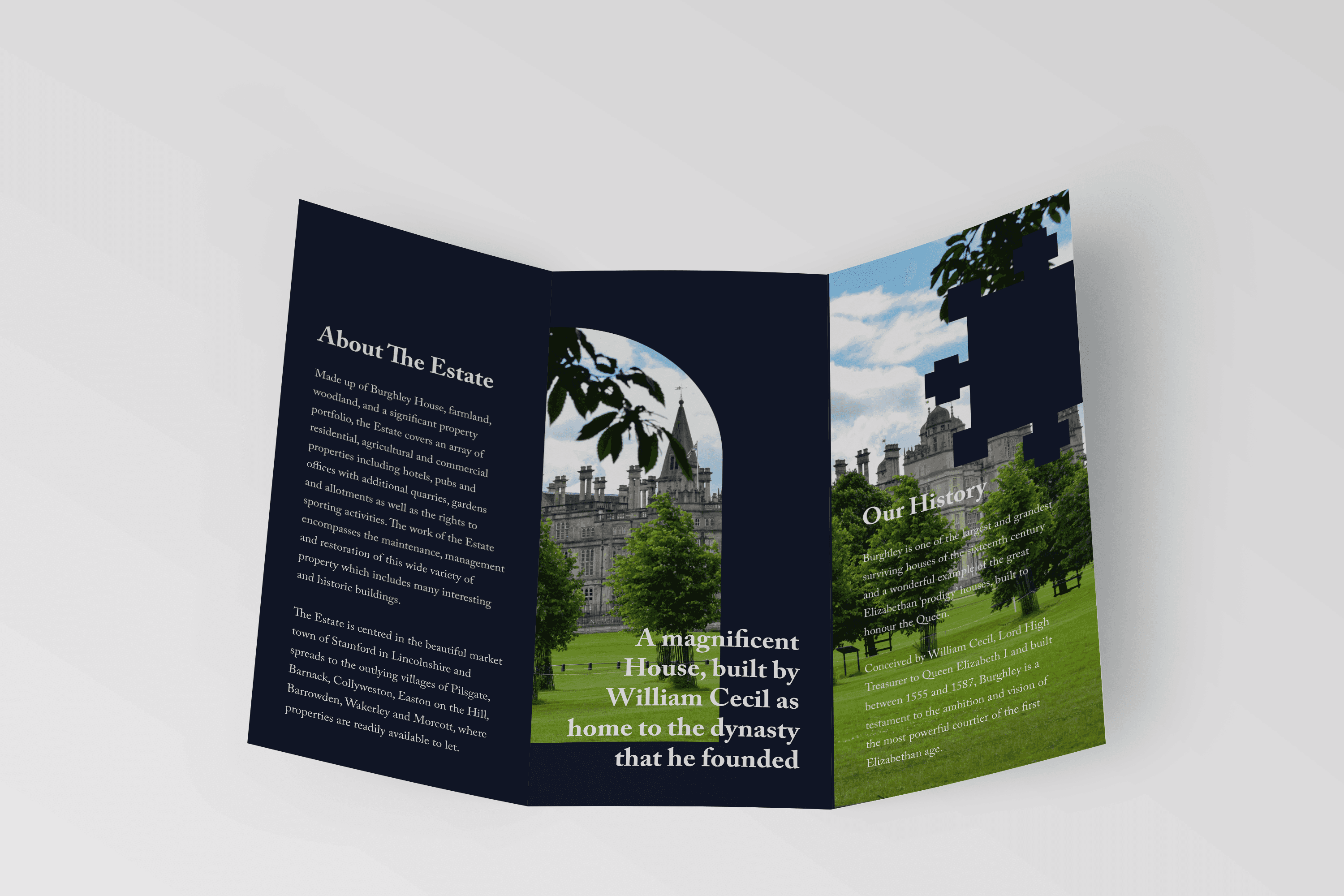 Concept: The logo and general branding for Burghley is dated and does not reflect the house, its character or its rich history as well as it could. As a result, a fresh but classical rebrand is needed. A logo is needed that reflects the extensive history of the house and estate. Graphic elements will be drawn from the architectural features of the house, helping to tie the estate together to the house and adding more visual interest to the branding. Additionally, a tasteful colour palette that compliments and enhances the estate, without distracting from it with bright unnecessary colours.
