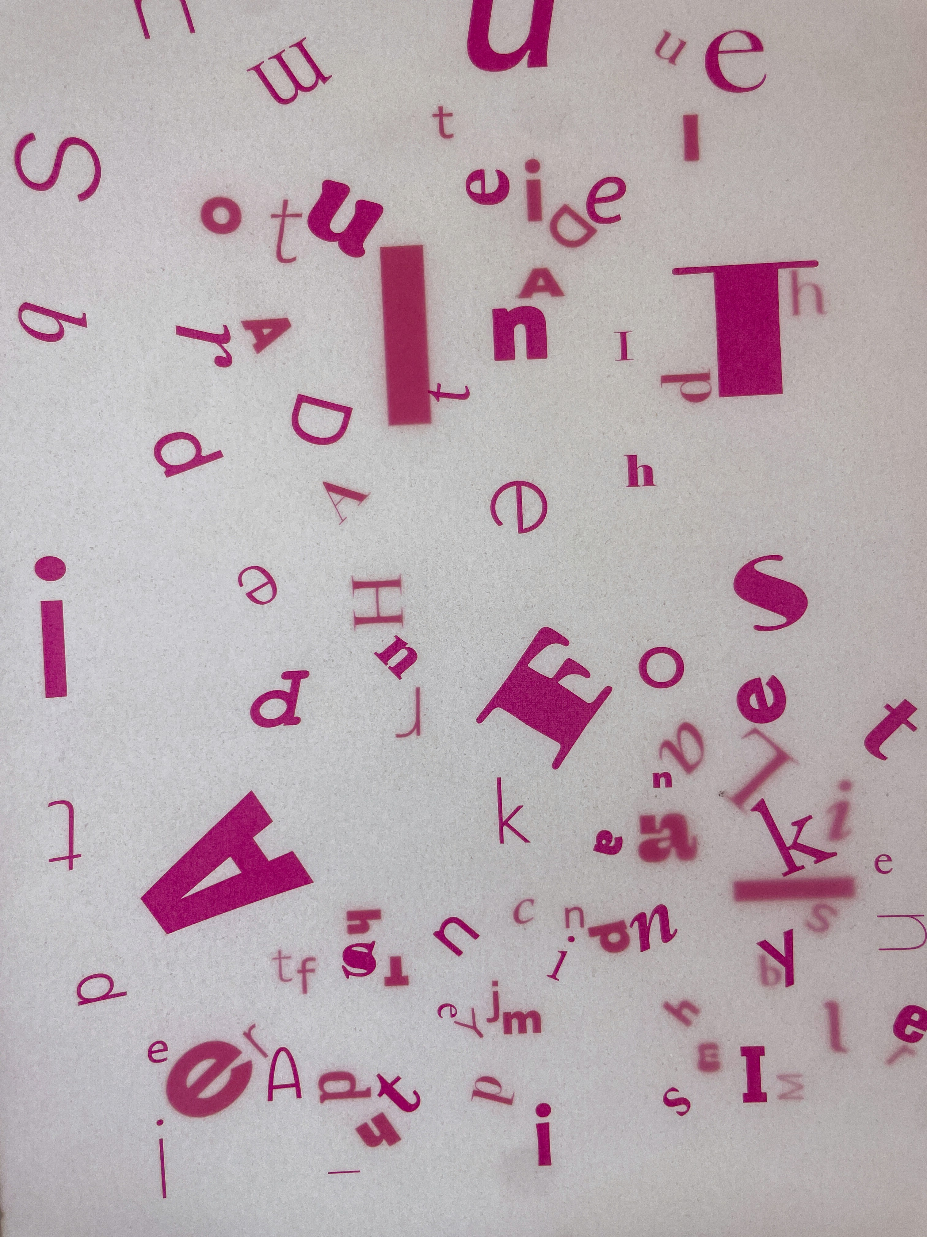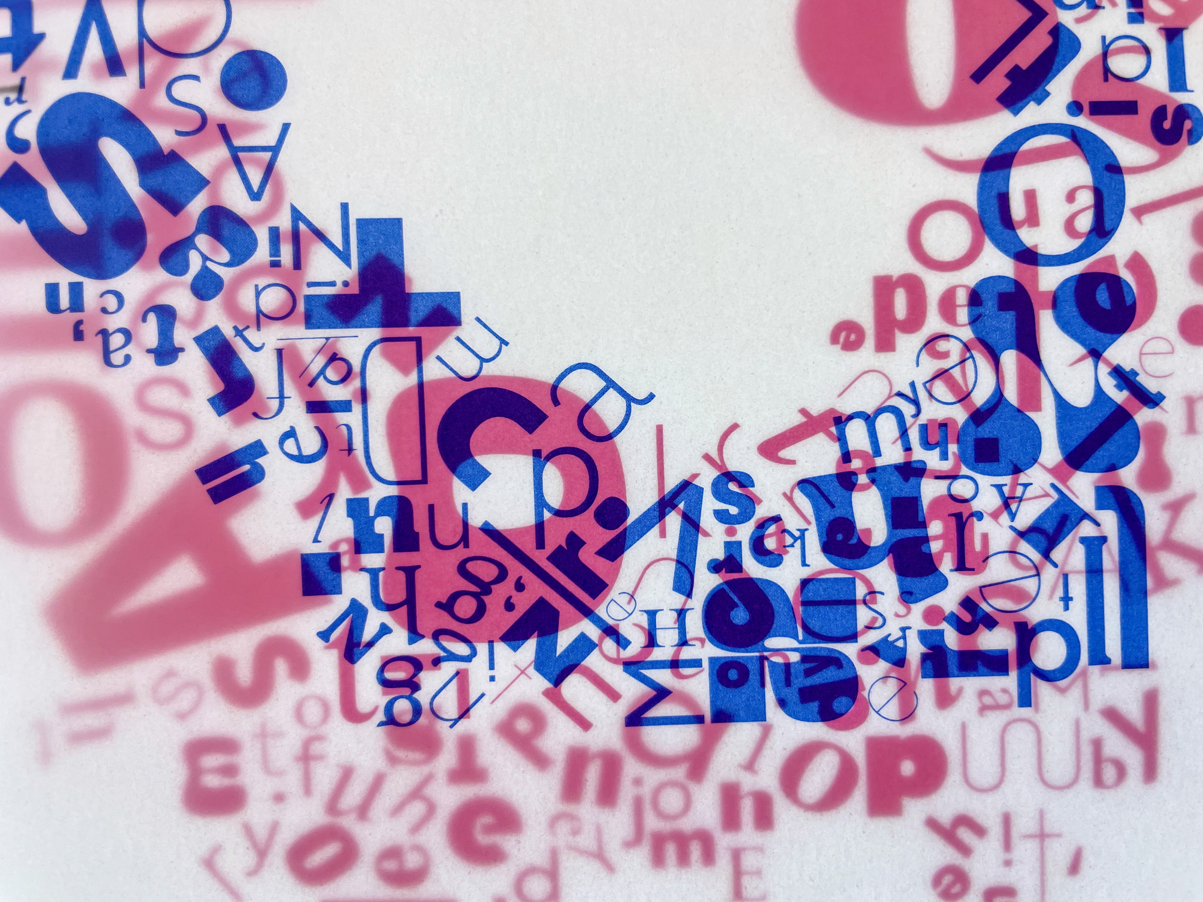 Concept: Exploring colour, letterforms and the layering of hidden words. Through printing on partially transparent paper, I was able to explore the impact of layering of pages and the shapes, words and colours that resulted from this exploration.