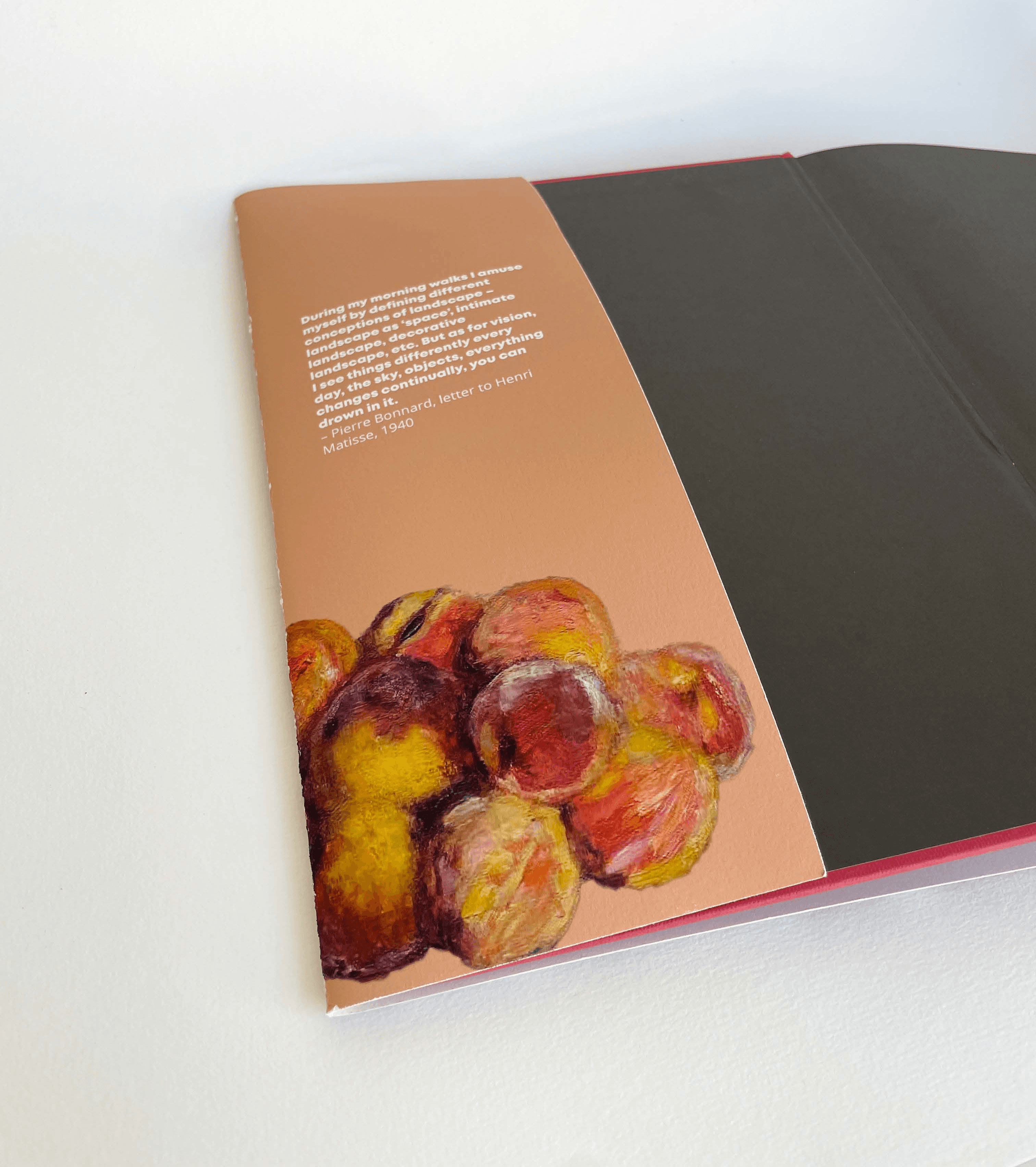 Outcome: Two posters, one of which incorporates a snapshot of work from Bonnard's painting, 'The Studio with Mimosa' 1939-46. The second, using an original painting of mine, with a strong focus on the colours seen in Bonnard's own paintings, especially that of 'The open window, yellow wall' 1919 and 'The Studio with Mimosa' 1939-46, with both posters aiming to advertise the opening of the exhibit. Finally, the book jacket incorporates sections and elements of Bonnard's paintings, including; 'Dinning room overlooking the garden' 1930-31, 'The window' 1925, 'The Studio with Mimosa' 1939-46, and finally 'The peaches' 1916. To compliment the colours within the paintings, the spine and front and back flaps use the same colour to subtly tie the three pieces of work together and make them feel cohesive. The purpose of the book is to advertise a book, being 'sold' by the NGV to share his work with more viewers.